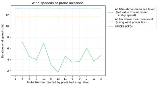 The wind speeds measured at different probe locations are shown in Figure 12. The wind speeds would vary depending on the ship design, which affects the wind flow around the vessel. Very low wind speeds at, for example, probe 13, could be a direct result of a wake region at the aft of the vessel; however, a reason why the measured wind speeds in the CFD simulation are generally lower than the relative wind speed estimated at the given height could be the proximity of the probe centers to the vessel surface.
