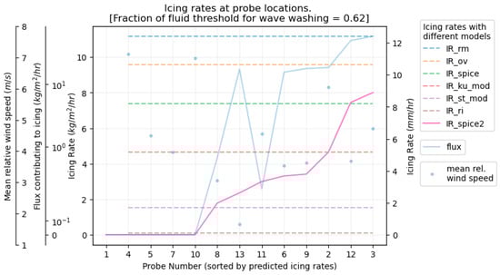 Figure 13 shows the results of the icing rates at different probes. The plot provides icing rates estimated with the other models for comparison as in Deshpande, 2024 (rm: Roebber&Mitten, ov: Overland, ku_mod: modified Marice, st_mod: modified Stallabrass, ri: Rigice04; see Deshpande, 2024, for more details regarding each of these models) at a height of 3 m, which is approximately the height above the mean sea level at which the deck is located when on top of a wave crest. Icing rates are represented in both, kg/m2/h as obtained from the Spice model, and in mm/h assuming an ice density of 900 kg/m3 [7]. Additionally, the plot provides icing rates estimated by the first Spice model using only the inputs given in Table 1, and estimating the other variables using the ‘feature calculator’ [7]. Information is also provided regarding the flux and relative wind speed computed at each probe. The plot is sorted by ascending value for icing rates predicted by Spice2. The original Marice model uses CFD to estimate distribution of droplet impingement on the structure, and RIGICE04 provides vertical distribution of icing in steps of 1 m [5,23]. All other models, including that of Spice in its original form, and ku_mod, developed for representational purposes, estimate a general icing rate for a given case and are unable to provide the distribution of icing over the vessel or structure. Thus, the icing rate estimated with these models at any given probe is constant.