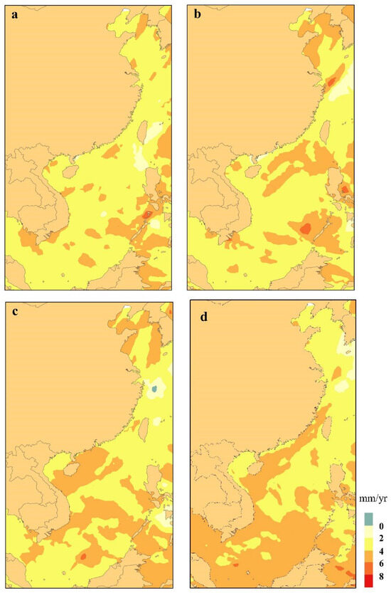 - Yuan, J. Modeling of Mean Sea Level and Fine Sea Level Changes Based on Multi-Source Satellite Altimetry Data. Ph.D. Thesis, Shandong University of Science and Technology, Qingdao, China, 2021. [Google Scholar]