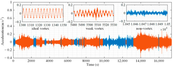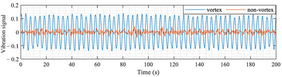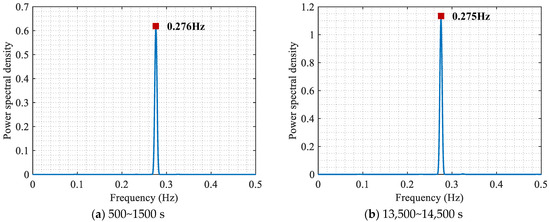 Figure 2. When the vortex-induced event occurs, only one mode significantly contributes to the vibration signal, resulting in the presence of a single prominent peak in its power spectral density function. This one-peak phenomenon does not appear in the power spectral density function of non-vortex-induced vibration signals. When only one peak significantly contributes to the power spectral density function, the energy concentration factor defined in Equation (7) becomes a small value, which can be utilized to detect vortex-induced vibration events.