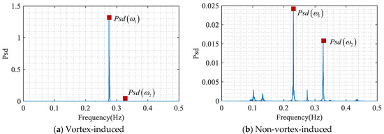 Figure 1 as an example, the power spectral density functions related to vortex-induced vibration and non-vortex-induced vibration are displayed in