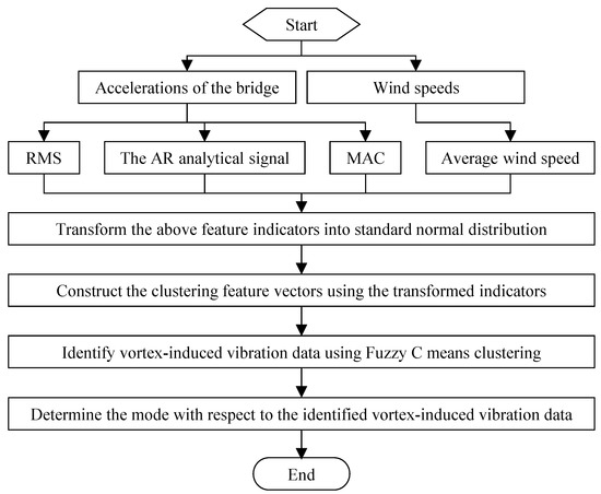 In this study, an almost real-time automatic identification method for vortex-induced vibrations in long-span bridges is introduced. Initially, the instantaneous classification indices for vortex-induced vibrations are derived from the vibration acceleration data of bridges. Subsequently, the vortex-induced indices are analyzed using fuzzy C-means clustering to achieve the automatic detection of vortex-induced vibration events without the need for thresholds. To guarantee the availability of identification and improve automation, the vortex-induced indices used in clustering are initially transformed into a standard normal distribution. Finally, the monitoring data from actual bridges is utilized to validate the feasibility of the classification framework. At the same time, results from the analysis of the correlation between environmental factors and acceleration amplitudes are provided to guide the prediction of vortex-induced vibration amplitudes.