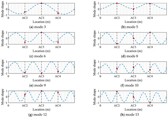 , the modal assurance criterion (MAC) in Equation (10) can be used to quantify this proportional relation. The MAC ranges from 0 to 1, with a higher MAC value indicating a stronger proportionality between the two vectors.