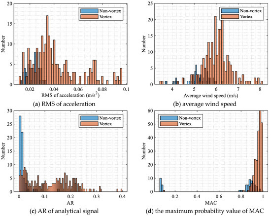 27] introduced a classification method for vortex-induced vibration events using supervised learning techniques. Thirteen vortex-induced features, such as the RMS, maximum value, skewness, and kurtosis of acceleration, as well as the peak factor, mean wind velocity, and incident angle, were utilized in their study. Li et al. [