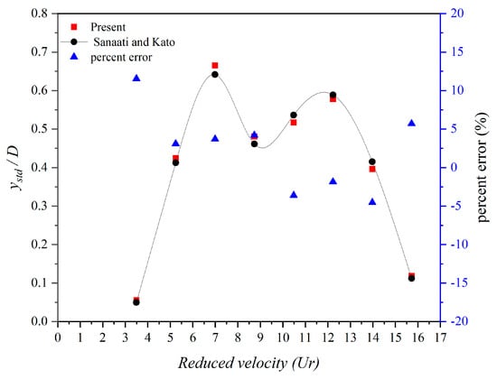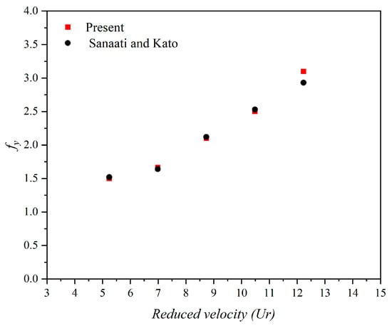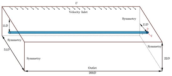 Based on the experiments by Sanaati et al. [], the vortex-induced vibrations (VIV) of a three-dimensional flexible smooth cylinder were simulated to validate the accuracy of the numerical method used in this study. The numerical simulation of the smooth riser VIVs was conducted with inflow velocity ranging from  to  at intervals of . The corresponding reduced velocity range and Reynolds number range are shown in Table 3. The reduced velocity is given by , where fnw is the first natural frequency of the smooth riser in still water.