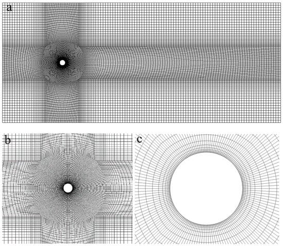 Discretization of the computational domain. (a) Mesh division of the computational domain; (b) encrypted area near the cylinder; (c) close-up of the meshes near the cylinder.