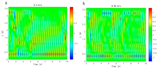 Figure 7 shows the time-history contour plots of the riser’s cross-flow vibration response at different flow velocities. The horizontal axis is represented as time, the vertical axis is represented as the longitudinal height of the riser, and the colors in the figure represent the ratio of the vibration response amplitude to the riser diameter, with red representing positive values and blue representing negative values. As seen in the figure, the vibration amplitude is smaller at the ends of the riser, where it is fixed, and is larger in the middle. At lower flow velocities (), the vibration amplitude is low and relatively uniform, with minor variations along the river’s length. The vibration response is relatively linear, showing a simple vibration mode with a clear standing wave characteristic and stable waveform. At this stage, the vibration is mainly exhibited as low-order modes with longer wavelengths. As the flow velocity increases, the vibration amplitude is gradually increased, and the vibration mode becomes more complex. At moderate flow velocities ), high amplitude values are observed to begin appearing in certain areas, and the vibration response starts to exhibit non-linear characteristics. There is a mix of traveling and standing wave characteristics, with some stable standing waves and some traveling waves. Higher-order modes gradually appear, with shorter wavelengths and more complex vibration modes. When the flow velocity reaches  and above, the amplitude distribution is shown to become more complex, with multiple high-amplitude regions whose positions and numbers change with the flow velocity. The vibration response shows a significant non-linear dynamic behavior, with the vibration mode displaying clear traveling characteristics and a highly complex waveform, featuring multiple nodes and high-frequency characteristics.
