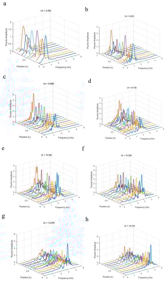 As the flow velocity increases, the vibration frequency and modes of the riser change significantly, and the amplitude distribution exhibits stronger nonlinearity and complexity. Figure 8 shows the spectral analysis of the transverse displacement at different flow velocities. In the figure, the -axis represents the frequency, the -axis represents the position along the span of the riser, and the z-axis represents the corresponding response amplitude.