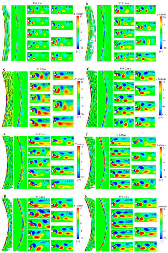 The vorticity contours and vortex-shedding pattern details (a) 0.1 m/s; (b) 0.15 m/s; (c) 0.2 m/s; (d) 0.25 m/s; (e) 0.3 m/s; (f) 0.35 m/s; (g) 0.4 m/s; (h) 0.45 m/s.
