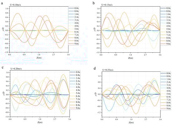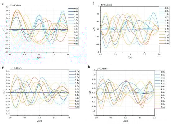 As shown in Figure 10, the transverse vibration response of the riser at different flow velocities is illustrated, expressed through the relationship between  and the height of the riser. Analyzing these plots can reveal the impact of flow velocity variations on the vibration amplitude and modes of the riser, as well as the vibration behavior at different positions along the riser (end and middle sections).
