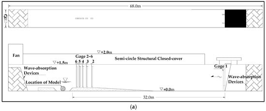 According to the Technical Specification for Simulation Testing of Water Transport Engineering (JTJ/T231-2021) [37], a normal model was adopted and designed according to the Froude number similarity law. The simulation of various physical quantities is as follows: geometric scale = 1:20; time scale ; weight ratio ; force ratio ; pressure ratio ; wave height to scale .