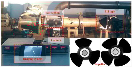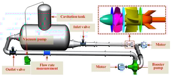 The experiments performed in this study included performance tests and high-speed photography experiments in the impeller. The closed test loop is displayed in Figure 1, which mainly consisted of inlet and outlet valves, a vacuum pump, a booster pump, a flowmeter, a cavitation tank, and stainless steel pipes. The booster pump would be started to increase the flow rate to the required flow rate condition, if the inlet and outlet valves were opened to the maximum and still could not reach the test flow rate. The active cavitation method was adopted for the cavitation experiment, which uses the vacuum pump to reduce the inlet pressure of the pump. The hydraulic components in the test section are enlarged in Figure 1. The high-speed photography system is provided in Figure 2, which mainly consisted of a camera, a fill light, and an image display device. An ISPEED-3 high-speed camera producted by Olympus Corporation (Tokyo, Japan) was utilized to capture the images with a sampling frequency of 4000 Hz, which was set based on a comprehensive consideration of the shooting resolution and cavitation evolution period in the tip region. Organic glass was chosen to create a transparent casing wall that was circular inside and square outside, to obtain a similar refractive index to fluid. The uncertainty of the refractive index was 1.492 ± 0.0004. The specific experimental procedure and uncertainty analysis were published in a previous study [27], including the measurement uncertainties of Q = 365.75 ± 0.89 m3/h, H = 3.13 ± 0.01 m, and torque T = 234.12 ± 0.50 N·m.