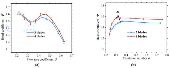 The cavitation performance curves σ-Ψ under the design conditions are depicted in Figure 3b, which presents a similar change trend, but there is a certain difference in head coefficient Ψ at different cavitation numbers σ. As the cavitation number σ decreases, the cavitation performance curves experience the stages of no cavitation, cavitation inception, cavitation development, and severe cavitation after the critical cavitation condition. The curves are relatively gentle and the head coefficient Ψ increases slightly before reducing to the critical cavitation number σc. The initial cavitation nuclei attached to the blade surface gradually grow into cavitation bubbles, which have a drag reducing effect on the blade surface, causing the slight increase in head coefficient Ψ [22]. When the cavitation number σ is less than σc, the cavitation morphology blocks the flow passage, causing a significant deterioration in pump performance. Figure 3b shows that the σc of the three-blade impeller is 0.341, while that of the four-blade case is 0.301, indicating that more blades bring a better anti-cavitation performance. However, the σ-Ψ curve of the four-blade impeller has a larger slope below σc, meaning that the cavitation deteriorates rapidly.