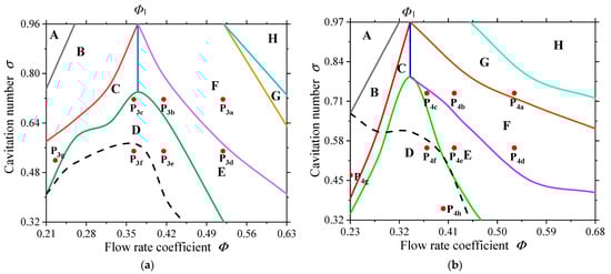 The cavitation maps for the three-blade and four-blade impellers were constructed according to the cavitation forms in each operating condition, based on the variations in flow rate coefficient Φ and σ. The cavitation maps contained eight regions, labeled from A to G, representing the presence of clearance cavitation, shear layer cavitation, tip leakage vortex cavitation, and SSPCVs. Overall, as the blade lattice solidity increases, the range of operating conditions with no cavitation or slight cavitation in the tip region becomes wider. SSPCV mainly appears under a low cavitation number and partial-load conditions. In particular, both impellers have a certain flow rate coefficient Φ1, and the SSPCV will always appear in the flow passage as the Φ is larger than Φ1.