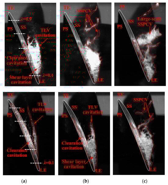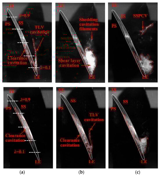 In order to better understand the typical cavitation patterns, the high-speed photography experimental results under different operating conditions were selected for comparison. The selected operating points are marked by red dots in Figure 4, including P3a–P3g for the three-blade impeller and P4a–P4h for the four-blade impeller. Figure 5 illustrates the tip cavitation images of two impeller cases under different conditions with σ = 0.74. The blade chord length is represented by white dotted lines, and the chord ratios λ from LE to TE correspond to 0.1, 0.3, 0.5, 0.7, and 0.9, respectively. The first row provides the visual images of the three-blade impeller at Φa = 0.53, Φb = 0.42, and Φc = 0.37. Under the Φa condition, clearance cavitation exists in the range of 0.05 < λ < 0.5, while the TLV cavitation extends from LE to λ = 0.55. There is an angle between the TLV and the blade, forming a stable ‘V’ shape. In terms of the four-blade impeller, only clearance cavitation appears in the tip region, and its starting position moves backward compared with the three-blade impeller, covering the range of 0.3 < λ < 0.8. Reducing the flow rate coefficient Φ to Φb, the operating points locate in area E and F in Figure 4a and Figure 4b, respectively.