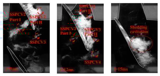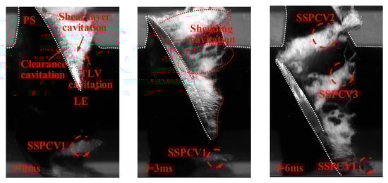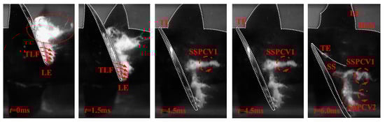 Goltz et al. [39] found the backflow phenomenon at the blade leading edge near the tip inrotating stall conditions. The attached sheet cavitation gradually moves away from the blade surface and forms a cavitation cloud driven by the tip leakage flow near the blade tip. During 0~1.5 ms, there is a cavitation cloud in the elliptical region detaching from the triangle cavitation tail. The shedding cavitation cloud is surrounded by vortex filament dissipation, and its main part is continuously entrained to form SSPCVs. SSPCV1 is gradually formed at the time of 3.0~4.5 ms, moving towards the blade TE, with a foot attached to the blade surface. At t = 6.0 ms, another weaker cavitating vortex SSPCV2 appears. Meanwhile, SSPCV1 gradually weakens as it migrates in the flow passage until it dissipates and disappears. SSPCV2 travels a similar path to SSPCV1 and dissipates earlier in the flow passage due to its weaker strength.