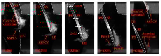 The evolution of tip cavitation with four blades under the condition of Φ = 0.23, σ = 0.47 is provided in Figure 8, which also belongs to area B in Figure 4b. At t = 0~3.0 ms, the clearance cavitation in the blade tip region and the cavitation cloud on the suction surface near the blade tip are stably attached to the blade surface. During this time, the SSPCV from the previous flow passage moves to the blade leading edge. Until t = 6.0 ms, the SSPCV is cut by the blade leading edge into two parts. Part I continues to migrate downstream and dissipates rapidly near the blade pressure surface in the original flow passage. Part II enters into the next blade passage and interferes with the cavitation attached to the suction surface. The cavitating flow field in the blade tip region is severely disturbed, where the clearance cavitation and the cavitation attached to SS are connected at the blade tip leading edge. The disturbance of Part II on the blade SS gradually propagates backward. The cavitation tail attached to the suction surface oscillates more significantly at t = 6.0 ms. The shedding vortex filaments are enhanced in quantity and scale. At this moment, another SSPCV appears at the next blade leading edge. However, there is no visible cavitation shedding from the blade suction surface and blade tip to form the SSPCV. Therefore, it is hypothesized that the formation mechanism of the SSPCV under part-load conditions is different from that under over-load conditions.