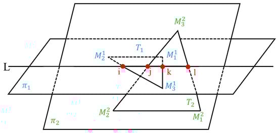 For each triangle’s vertices, a cyclic replacement operation is performed so that vertex () is situated on one side of the plane π2 (π1), while the other two vertices are on the opposite side. For vertices and (,), simultaneous exchange operations ensure that vertex () is positioned above the plane π2 (π1) in the direction normal to it. Through these preliminary exclusions and substitutions, adjacent edges of vertices , , and , intersect at points i, j, k, l (where i < j < k < l). These four points correspond to two closed intervals on L: L1 = [i, j] and L2 = [k, l]. Consequently, the problem of testing the intersection for two triangles can be transformed into assessing the overlap between two closed intervals, L1 and L2. When L1 and L2 overlap, the triangles intersect; otherwise, they do not intersect.