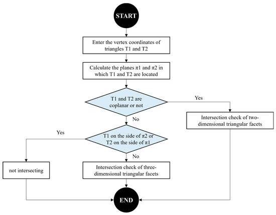 The relative positional relationships among points, lines, and planes are assessed by evaluating the positive and negative determinants that correspond to the coordinates of each triangle’s vertices according to the algorithm. Model interference occurs when two triangles intersect. The fundamental principle of this method is as follows: