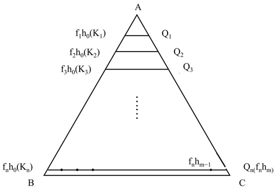 where represent the 3D coordinates of the point , and denote the 3D coordinates of vertex A. Subsequently, the parallel lines that pass through points , , , ……, and are parallel to the edge BC. These lines intersect with edge AC at points Q1, Q2, Q3, …, Qn, respectively. Similarly, the lengths P to K1Q1, K2Q2, K3Q3, …, KnQn on each side of the equidistant differential are determined. The coordinates of each partition point are then calculated. The triangle similarity property is employed to solve for the lengths of sides K1Q1, K2Q2, K3Q3, …, KnQn, as demonstrated in Equation (7). This is followed by the equidistant differentiation of each side according to Equation (8), after which the coordinates of each cut-off point are determined using Equation (9).