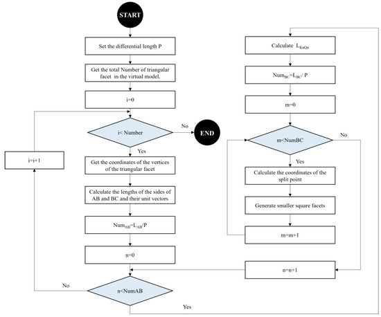 Ultimately, the initial triangular facet is substituted by a quadrilateral facet with side length P, which is created using all the division points of the triangular facet as central points. Similarly, by applying this operation to all the triangular facets that constitute the model, the original triangular facets can be effectively replaced by the newly generated quadrilateral facets. The specific execution process of interference checking based on the differential triangle facets algorithm is illustrated, as shown in Figure 7. Building upon intermediate interference checking, further subdivision of the triangular facets that make up the virtual model allows for accurate acquisition of the interference dimensions of the two models by controlling the segmentation length P. This confirms the feasibility of the test assembly scheme.