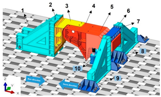 Schematic diagram of the connector model testing system (1—test platform, 2—reaction frame, 3—bow connector, 4—stern connector, 5—loading device, 6—transverse reaction frame, 7—beam, 8—inner fixing fixtures, 9—outer fixing fixtures, 10—cylinder actuator).