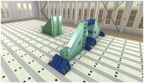 Four reaction frames, a beam, and two sets of inner and outer fixed fixtures are used to establish the foundational framework for the testing system. These models are all reused in the laboratory, so laser scanners are used to obtain their STL models and import them into the system platform. The virtual model exhibits a more regular shape, and during actual installation and testing, deformation is nearly imperceptible. Therefore, only primary interference inspection is needed to ensure accurate and error-free installation of the physical model, as illustrated in Figure 11.