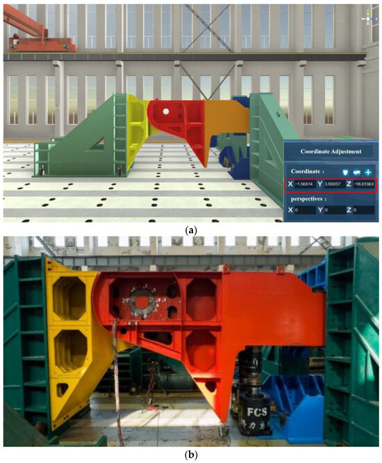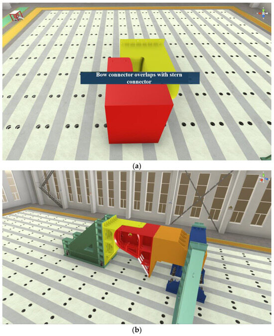 Upon the completion of the primary framework, the assembly of components such as the bow connector, stern connector, transverse reaction frame, and cylinder actuator demands a more refined method beyond simple initial interference checks. As shown in Figure 12a, taking the virtual assembly of the bow connector and stern connector as an example, the system prompts that they have collided without any contact. This is because it is difficult to fully fit the actual surface of the model into the OBB algorithm during the virtual assembly process. Therefore, the STL format file obtained by scanning the bow and stern connectors with a laser 3D scanner is imported into the Unity3D platform. The two models are attached by adjusting the 3D coordinates, and the Devillers and Guigue algorithm is used to determine whether there is interference between the two. Finally, the experimental system was assembled truthfully in the virtual space, providing a basis for accurately determining the dimensions of the pin axis in the future, as shown in Figure 12b.