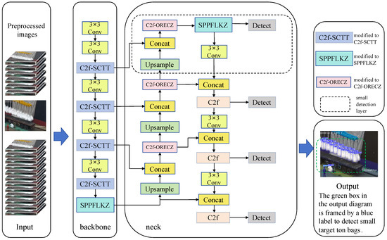 The task of logistics ton bag detection is usually limited by operational equipment (port area monitoring system), which requires a lightweight, low-latency, and high-accuracy model. The structure of the YOLOv8-TB proposed in this paper is detailed in Figure 2. This network consists of four parts, which are input, backbone, neck, and output.