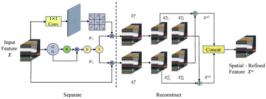 In the reconstruction part, two weighted feature maps with enriched information and with less informative features, are obtained by multiplying the feature map obtained after deformable interpolation by and the original input feature map X by . contains spatial content that is informative and expressive, while contains redundant and less useful information.Subsequently, the cross-reconstruction operation is used to mix them in order to enhance the exchange of information between different features. Finally, the cross-reconstructed features and are spliced together to obtain the spatially refined feature resultant map , and the whole reconstruction process yields through the following Equations (9)–(13):