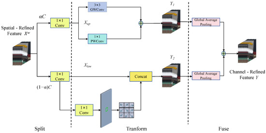 In the split stage, The result obtained after applying the DSRU operation, denoted as X ∈ , is used as the input to the DCRU to further extract rich representative features. Firstly, the channels of are divided into two parts, a parameter is set to control the allocation ratio of the channels to ensure the efficiency while balancing the computational cost, and the number of channels of the feature mapping is compressed using the convolution operation to improve the processing speed. After segmentation and compression, the spatially refined feature is divided into upper part and lower part .