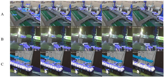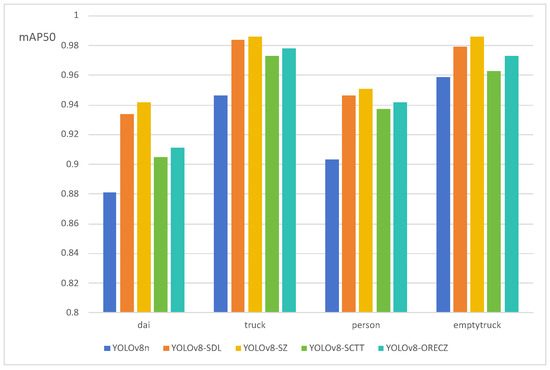 In order to compare the detection effect of different improvement modules on different types of objects, Figure 14 shows the mAP for the four types of targets in the ShipPort Logistics ton bag operation dataset. According to the experimental results, it can be seen that compared with YOLOv8n, the detection accuracy of the model with the addition of the four different improvement schemes alone has risen to a certain extent, among which the SPPFLKZ Attention Module and the Small Target Detection Layer have significantly increased the accuracy of the recognition of the ton bag’s small targets. Using the C2f-SCTT and C2f-ORECZ modules alone, small target recognition accuracies for ton bags show a small improvement along with a significant reduction in model size. When these modules are used in conjunction with the small target detection layer, the recognition of small targets such as ton bags and workers shows a significant and stable improvement.