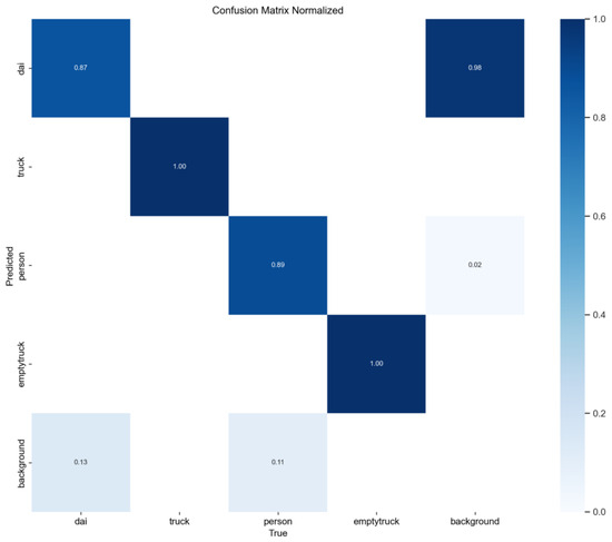 Figure 17 and Figure 18 show the loss function curves and accuracy curves of YOLOv8-TB on the training set and validation set, respectively. From the loss function curves, it can be seen that the loss curves of the training set and validation set almost decline synchronously and gradually stabilize, indicating that the model is well-fitted and has good generalization ability. From the accuracy curves, it is evident that the precision and confidence curves of the model for different categories (“dai”, “truck”, “person”, “emptytruck”) are very close, and there is no significant difference between the overall performance of the validation set and the training set. This demonstrates the consistency of the model during the training and validation phases, with no obvious signs of overfitting. The model shows high precision across different categories, and the confidence curves rise with increasing confidence and tend to stabilize, indicating that the model has strong generalization ability.