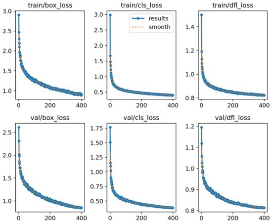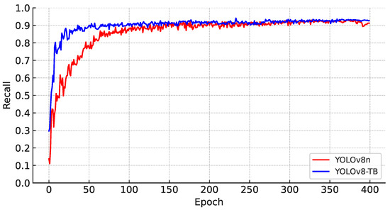 Figure 15 and Figure 16 demonstrate the overall situation of Recall and mAP50 after 400 rounds for YOLOv8n and YOLOv8-TB. It can be seen that the overall convergence of YOLOv8-TB is more stable than that of YOLOv8n, and at the same time, from the point of view of the exact value, YOLOv8-TB rises more rapidly.