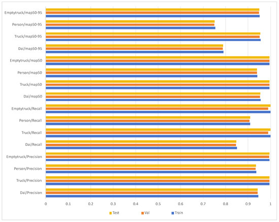 Figure 19 shows the detection performance metrics of YOLOv8-TB on the training, validation, and test sets for the four annotated categories. The Precision, Recall, mAP50, and mAP50-95 values across the training, validation, and test sets are very similar for each category, indicating that the model can accurately detect the targets without significant loss in performance. This demonstrates that the YOLOv8-TB model performs well in terms of generalization in this task, with no evident signs of overfitting.