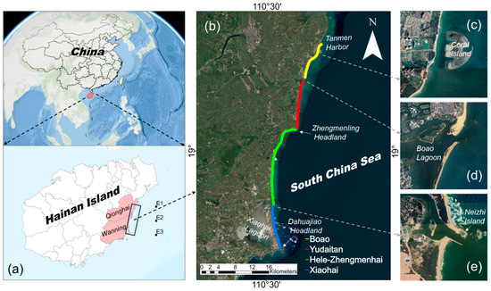 (a) Study area (depicted by the black box) located on the Qionghai–Wanning Coast of eastern Hainan, with the locations of the wave reanalysis grid points (E1, E2, E3); (b) detailed view of the four studied sections; (c) an offshore artificial island in Boao; (d) Wanquan River mouth; and (e) Xiaohai Lagoon inlet.
