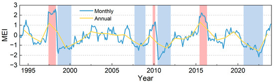 Monthly and annual averaged variations in the Multivariate ENSO Index (MEI) from 1994 to 2023 (light red shading denotes El Niño events, and light blue shading denotes La Niña events).