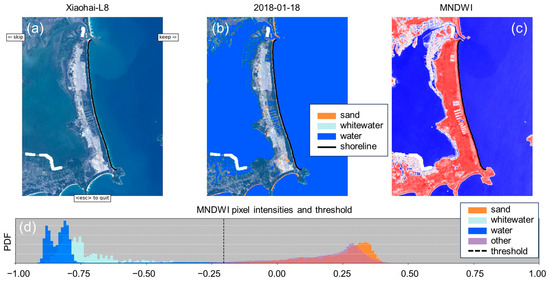 Outputs from the CoastSat tool: (a) RGB image of Xiaohai ROI from Landsat 8; (b) output of image classification where each pixel is labeled as “sand”, “water”, “whitewater”, or “other”; (c) grayscale image of the MNDWI pixel values; and (d) histogram showing the probability density function of MNDWI values for each of the four labeled classes and Otsu’s thresholding specific to the sand–water interface.