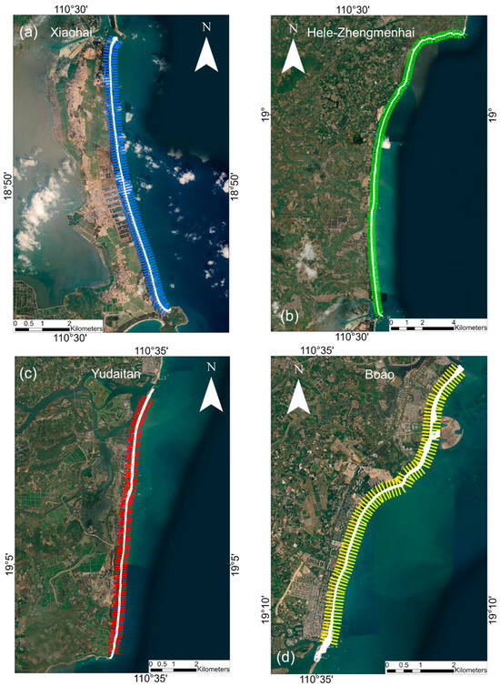 The details of the four studied sections and the associated transects: (a) Xiaohai, (b) Hele-Zhengmenhai (HZ), (c) Yudaitan, and (d) Boao.