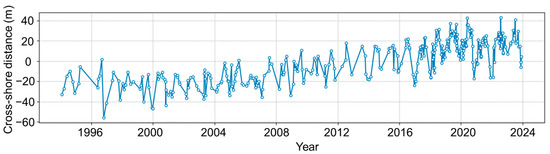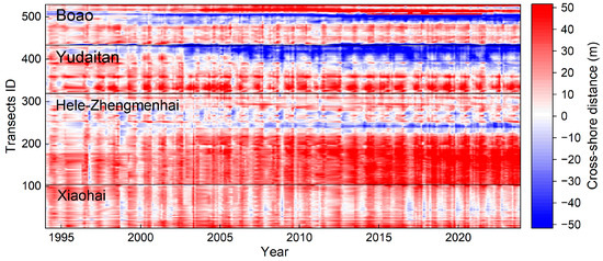 Spatiotemporal evolution of the cross-shore distance along the sandy coast from 1994 to 2023 (initially set at 0 m).