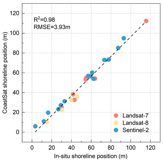 The quality of the CoastSat-derived shorelines is evaluated by comparing them with in situ measured beach profiles from August 2023 within the study area. Matching transects are selected in CoastSat, allowing for a time tolerance of 15 days between satellite image acquisition and in situ profile measurements. A scatter plot and best-fit linear regression illustrate the relationship between shoreline positions inferred from in situ profiles and those extracted from satellite imagery (Figure 7). The high correlation coefficient (R2 = 0.98) and low root mean square error (RMSE = 3.93 m) demonstrate that the satellite-derived shorelines closely align with the actual shoreline positions.