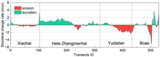 The long-term shoreline evolution from 1994 to 2023 for the sandy coast is summarized in Table 3. According to the results from the Theil-Sen estimator, the average rate of change in the sandy shoreline over the last 30 years has been 0.03 m/year, with an average NSM of 0.99 m. Among the 529 transects analyzed, 237 (44.8%) experienced erosion, with an average erosion rate of −0.77 m/year, while 292 (55.2%) exhibited accretion, with an average accretion rate of 0.68 m/year. Figure 8 illustrates the distribution of shoreline change rates along the 529 transects from 1994 to 2023, revealing uneven distribution across different subunits. Erosion hotspots are primarily concentrated around the Wanquan River mouth (northern Yudaitan and southern Boao) and the southern side of the artificial islands in central Boao. Accretion is most notable at the northern end of Xiaohai, the southern portion of HZ, and the northern end of Boao (Figure 9).