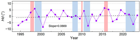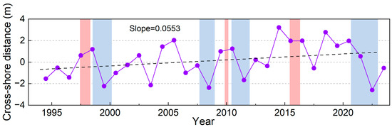 Annual averaged variations in cross-shore shoreline distance from 1994 to 2023 (light red shading denotes El Niño events, and light blue shading denotes La Niña events).