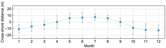 Cross-shore distances along the majority of transects in the study area exhibit significant seasonal oscillations, which are represented as high-frequency vertical stripes in Figure 10. The amplitude of these oscillations varies irregularly across different sections. Specifically, seasonal shoreline changes are characterized by seaward accretion during the summer and landward erosion in the winter. Figure 12 presents the monthly average cross-shore shoreline distance for transect No. 60 in Xiaohai, illustrating this seasonal variation, with values peaking in summer and reaching a minimum in winter. The seasonal erosion–accretion cycle is most pronounced in Xiaohai and southern HZ, while northern Boao displays less pronounced seasonal changes.