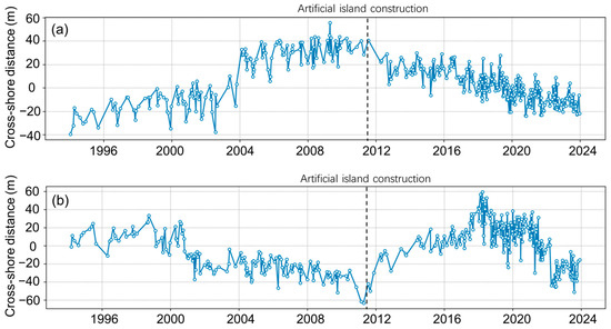 Time series of cross-shore shoreline change along (a) transect No.518, and (b) transect No.506 at Boao (the start of artificial island construction is indicated by black lines).
