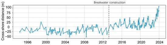 Breakwaters are also typical anthropogenic structures along the study coast. A breakwater was constructed south of the Xiaohai Lagoon inlet in 2013 (Figure 1e). Figure 14 clearly illustrates the impact of the Xiaohai Breakwater on the southern shoreline. Following the completion of the breakwater in 2013, Transect No. 103 exhibited significant accretion, with the cross-shore distance advancing by approximately 75–100 m compared to the pre-construction period.