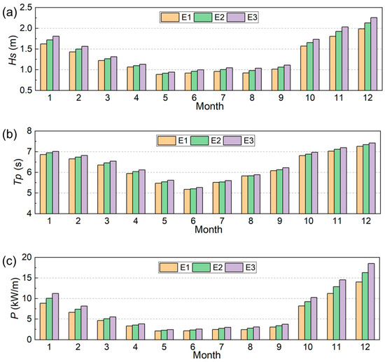 Monthly average (a) significant wave height, (b) mean wave period, and (c) wave energy flux at E1, E2, and E3 sites.