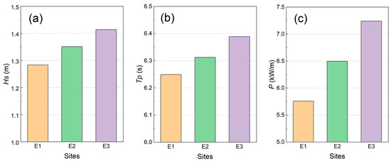 Figure 16 illustrates that the multi-year average values of Hs, Tp, and P are highest at E3 (Hs = 1.41 m, Tp = 6.39 s, P = 7.24 kW/m), followed by E2 (Hs = 1.35 m, Tp = 6.31 s, P = 6.50 kW/m), and lowest at E1 (Hs = 1.28 m, Tp = 6.25 s, P = 5.76 kW/m). The average distribution patterns of these wave parameters demonstrate a gradual increase from north to south.