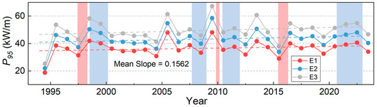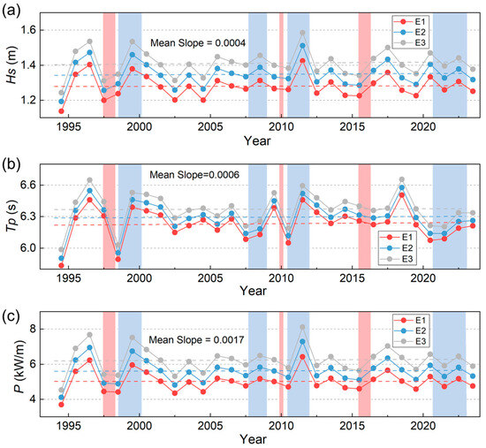 Annual averaged variations in (a) significant wave heights, (b) mean wave periods, and (c) wave energy flux at E1, E2, and E3 sites during the period from 1994 to 2023 (light red shading denotes El Niño events, and light blue shading denotes La Niña events).