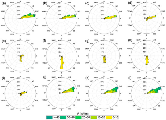 The wave parameters, including significant wave height (Hs), mean wave period (Tp), and wave energy flux (P), exhibit notable seasonal variations in the study area throughout the 30-year period. Figure 15 presents the monthly averages of Hs, Tp, and P at the E1, E2, and E3 sites, demonstrating consistent distribution patterns. Situated in a low-latitude, tropical monsoon region, seasonal wave variations are predominantly influenced by monsoons. During the winter half-year (October to March), northerly winds prevail, resulting in waves with Hs ranging from 1.22 to 2.26 m, Tp between 6.36 and 7.42 s, and P from 4.65 to 18.5 kW/m. By contrast, the summer half-year (April to September) is dominated by southerly winds, leading to smaller Hs (0.89 to 1.13 m), shorter Tp (5.18 to 6.22 s), and lower P (2.12 to 3.84 kW/m). The highest values of these parameters are recorded in December, significantly exceeding those of other winter months, while the lowest values occur in June and July, with minimal variation between May and September.